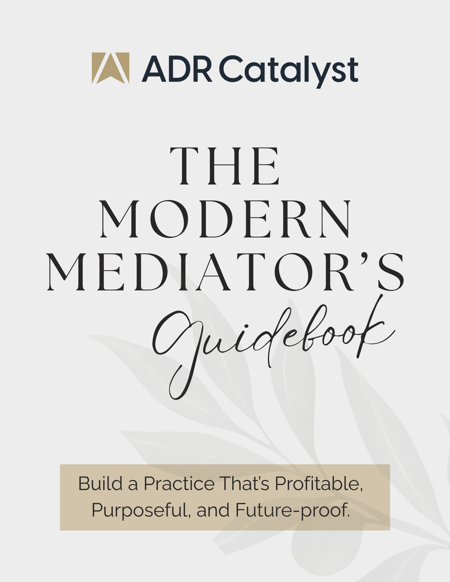 The Modern Mediator’s Guidebook is a free 24-page beginner framework that helps mediators transition from uncertainty to confidence in establishing a modern mediation practice. It offers a structured approach to building a sustainable and tech-enabled practice that aligns with your goals and values.